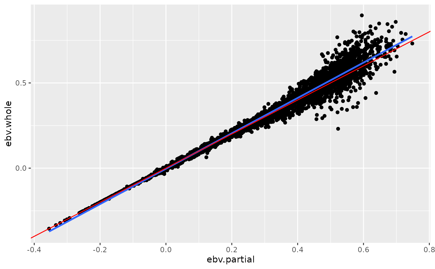 The above plot shows a scatterplot of the ebv from whole data and partial data. The blue line is the linear smoothed regression line and the red line is the expected regression line with a slope of \(1\).
